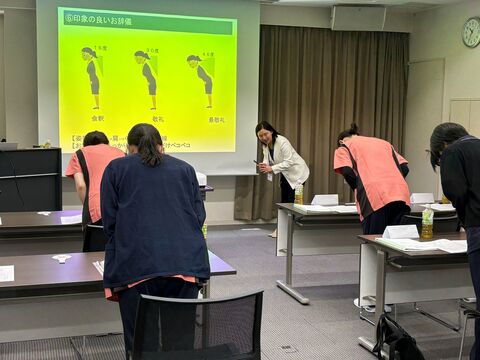 基本的な動作、挨拶のしかたやテクニック、電話の応対など多くのことを学びました。この学びを実践で活かしていけるようにがんばりましょう!